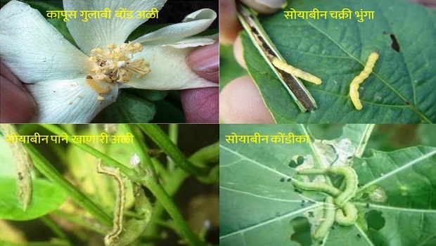 सध्या हवामान ढगाळ असल्याने व कपाशीचे पिक पाते, फुले लागण्याच्या अवस्थेत असल्याने गुलाबी बोंडअळीचे पतंग सक्रीय झालेले आढळून येत आहेत. मादी पतंग पाते, फुले यावर अंडी घालतात, त्यामुळे कपाशीच्या पिकात कामगंध सापळे लावण्याची ही योग्य वेळ आहे. सोयाबीन पिकावर प्रामुख्याने चक्रीभुंगा, कोंडीका तसेच पाने खाणाऱ्या अळीचा प्रादुर्भाव आढळून आला. त्या अनुषंगाने विद्यापीठातील किटकशास्त्रज्ञांनी पुढीलप्रमाणे कापूस व सोयाबीन पिकांवरील किडींचे व्यवस्थापन करण्याचे आवाहन शेतकऱ्यांना केले आहे.