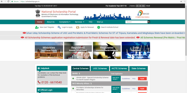 विद्यार्थ्यांनी www.scholarship.gov.in या संकेतस्थळावरुन ऑनलाईन पद्धतीने अर्ज करता येणार असून ऑनलाईन अर्ज करण्याची अंतिम तारीख 30सप्टेंबर 2018 आहे. सदर योजनेसाठी विद्यार्थ्यांनी National Scholarship Portal वरील मार्गदर्शक सूचना आणि Frequently Asked Questions वाचून दिलेल्या मुदतीत ऑनलाईन अर्ज करावेत.