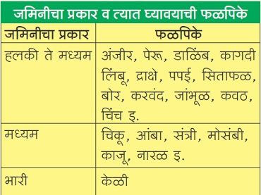 आपली जमीन कोणत्या प्रकारची आहे, हलकी, मध्यम कि भारी हे सर्वाना परिचित असतेच.जर माहिती नसेल तर माहिती करून घ्यावी. जमिनीची खोली किती आहे? जमिनीच्या खाली मुरूम किती खोलीवर आहे? जमिनीचा निचरा कसा आहे? त्याचा अभ्यास करूनच फळबाग निवडावी. जमिनीची निवड करताना निचरा उत्तम असणे आवश्यक आहे. फळबागेसाठी कमीत कमी 1 मीटर खोलीनंतर मुरमाचा थर असणारी जमिन निवडावी. भरपूर सेंद्रिय कर्ब असणारी, भुसभुशीत, मध्यम पोताची जमिनीचा सामू 6 ते 7.5 पर्यंत असावा. मुक्त चुनखडीचे प्रमाण 10 टक्क्यापेक्षा कमी असावे. जमिनीचा उतार 2 ते 3 टक्क्यापेक्षा जास्त नसावा. ज्या ठिकाणी फळबाग लावायची आहे, त्या ठिकाणच्या मातीचे परिक्षण करून घेणे आवश्यक आहे.