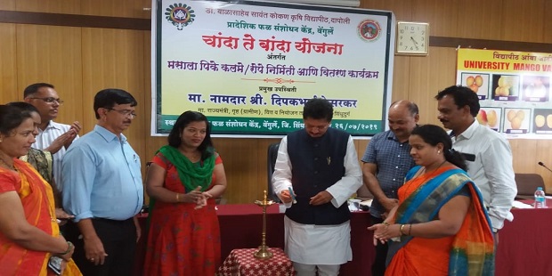वेंगुर्ले येथील प्रादेशिक फळ संशोधन केंद्रात आयोजित चांदा ते बांदा योजनेअंतर्गत मसाला पिके कलमे रोपे निर्मिती आदि वितरण कार्यक्रमात पालकमंत्री दिपक केसरकर प्रमुख पाहुणे म्हणून बोलत होते. यावेळी व्यासपीठावर वेंगुर्ला पंचायत समितीचे सभापती श्री. मोरजकर, उपनगराध्यक्ष सौ. अस्मिता राऊळ, निवासी उपजिल्हाधिकारी शुभांगी साठे, सहयोगी संचालक डॉ. बलवंत सावंत, प्र.अधीक्षक कृषी अधिकारी एस. एन. म्हेत्रे, तहसिलदार प्रविण लोकरे आदी मान्यवर उपस्थित होते.