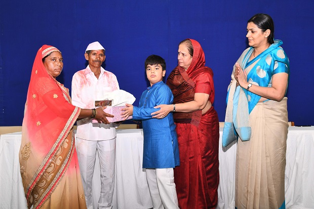 पोळानिमित्त भेटवस्तू देऊन सालदारांचा कृतज्ञतापूर्वक सत्कार करताना अन्मय जैन, ज्योती जैन, डॉ.भावना जैन.